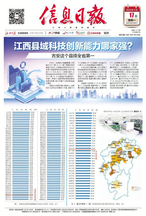 本报讯 (全媒体记者谢梦丽) 江西省内100个县(市、区),哪个更具科技创新能力?近日,江西省科学院发布《2024年度江西省县域科技创新能力评价报告》(以下简称《报告》)。《报告》显示,江西全省综合科技创新水平进一步提升,100个县(市、区)创新能力的差距进一步缩小,多层次、各具特色的县域创新体系更加完善,有力支撑了江西创新型省份建设。