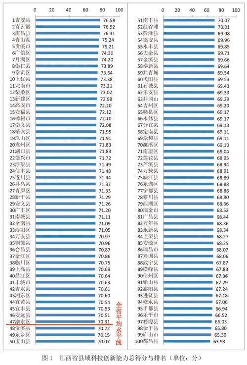 从本次评价结果来看,2024年度江西全省县域科技创新能力平均得分为70.23,较2023年度提高0.28;平均得分以上的县(区、市)有47个,较上一年增加2个;得分最高的三个地区依次是吉安市吉安县、南昌市青云谱区、南昌市南昌县。
