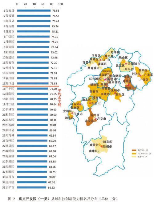依据江西省主体功能区规划及各县区产业发展等情况,《报告》对全省县(市、区)按重点开发区(35个)、农业主产区(33个)、重点生态区(32个)进行分类比较分析。重点开发区平均得分为71.34,农业主产区平均得分为69.25,重点生态区平均得分为70.03。吉安市吉安县、抚州市崇仁县、赣州市上犹县分别位列各类区域第一。