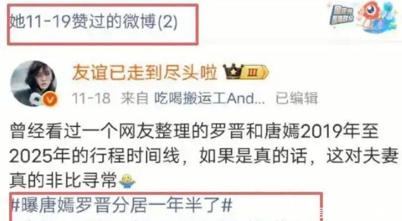 【2】在罗晋父亲去世的消息传出前,罗晋和唐嫣就深陷婚变的舆论漩涡。网络上流传着各种猜测,有的说两人已分居一年半,商业版图毫无关联;有的甚至搬出所谓圈内人来佐证,如张歆艺点赞相关爆料的举动。