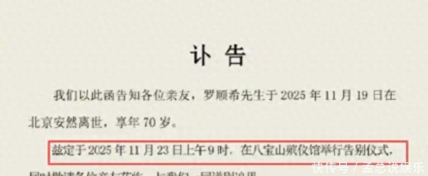 11月19日,罗晋的父亲罗顺希先生正规配资平台推荐,因病于北京离世,享年70岁。讣告里写道,罗晋因“万分悲痛”,难以亲自面对公众,父亲的告别仪式定于11月23日,在八宝山殡仪馆举行。